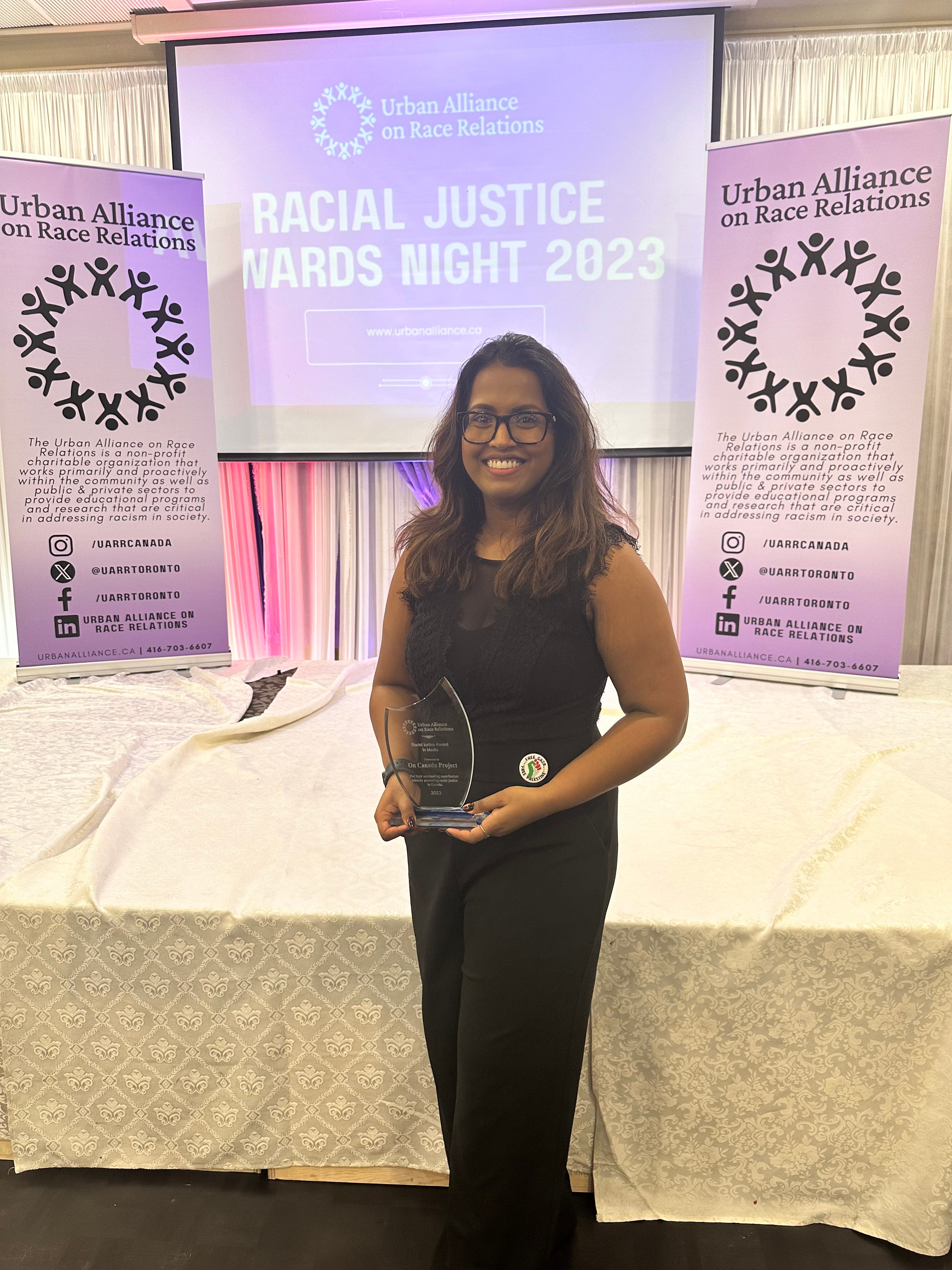 I want to say thank you to the Urban Alliance on Race Relations, and shout out all the fellow recipients! I also want to thank my parents and ancestors - for the values, resilience, and wisdom that allow me to be the person, writer, leader and activist that I am. I also think it’s important to note that I’m the daughter of two Tamil refugees (who fled their intentionally destabilized by colonial powers homeland). This means that every opportunity and privilege that I have here in Canada, comes at the unacceptable, unjust and inhumane cost of historic and ongoing colonization and colonial violence of the Indigenous peoples of this land.