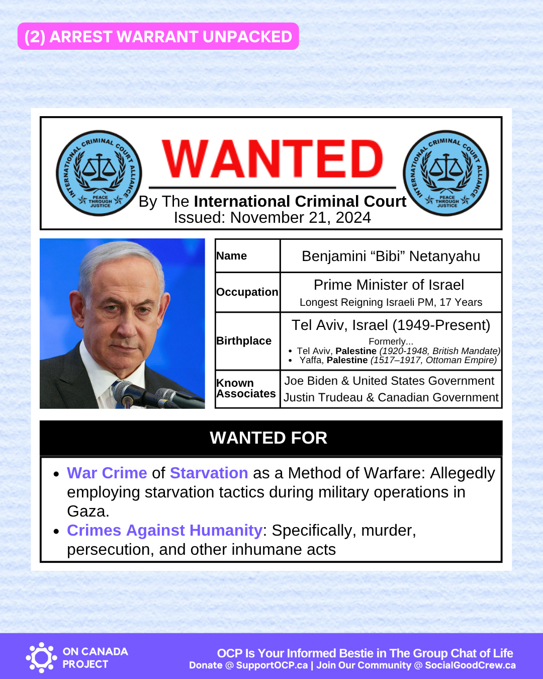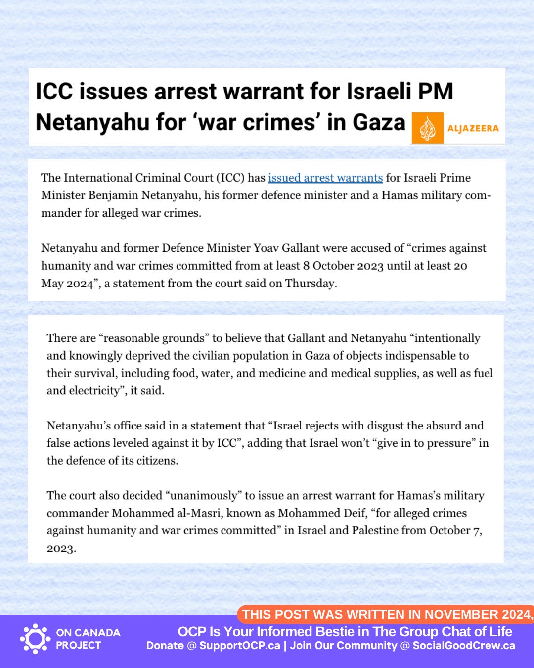 https://www.cbc.ca/news/politics/canada-israel-friendship-gaza-1.7541957 https://www.ctvnews.ca/politics/article/trudeau-says-canada-would-abide-by-icc-arrest-warrant-for-israel-pm-netanyahu/