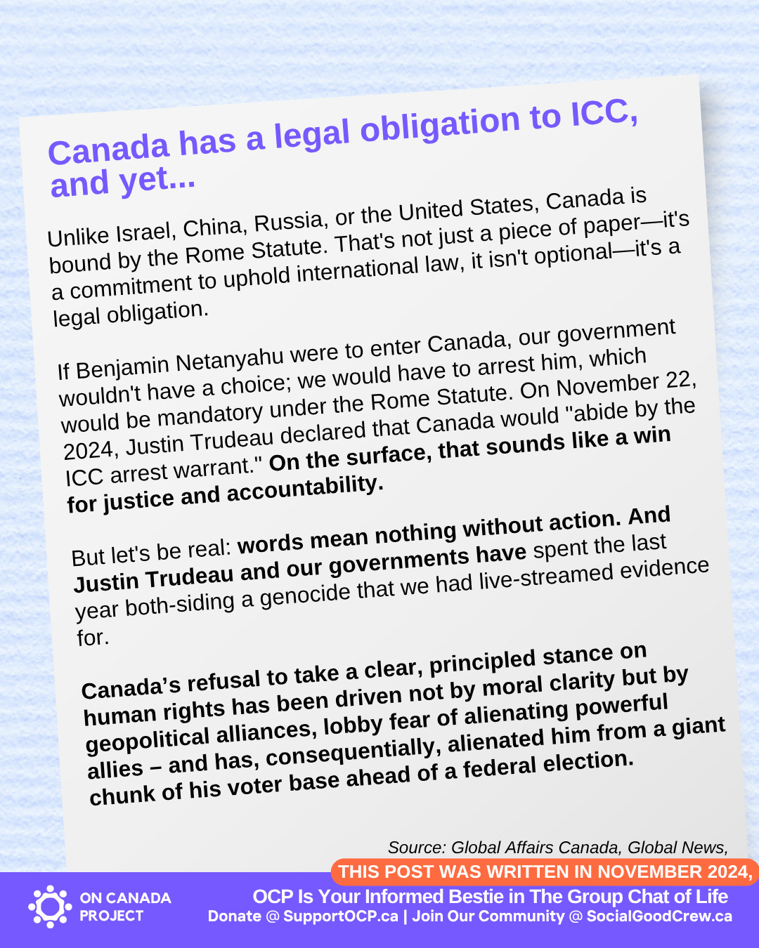 When they call enforcing an ICC warrant “virtue signaling,” they’re not critiquing empty gestures—they’re dismissing justice as ideological preference. Enforcing this warrant isn’t performative. It’s what countries that claim to respect international law are obligated to do. Canada is a signatory to the Rome Statute that created the ICC. Enforcement isn’t a choice.